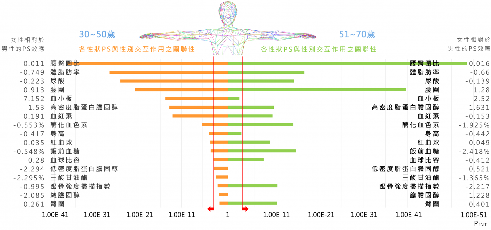 - 女性相對於男性的PS效應:數值顯示該性狀的PS效應,且呈現方式為女性與男性間PS效應差異;例如,PS每增加一個標準差,50歲以下女性的腰臀圍比男性增加0.011。